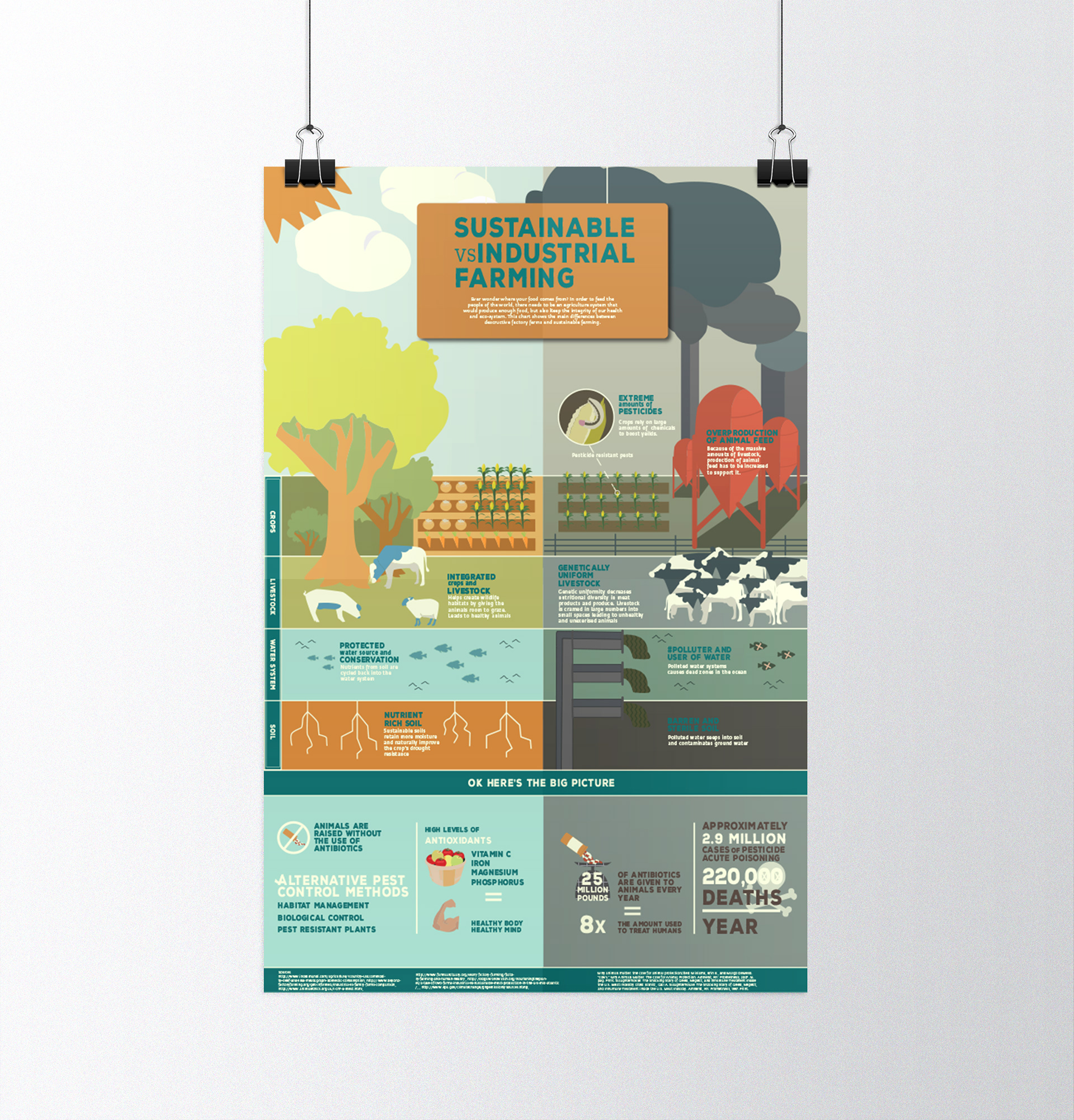 This infographic illustrates the main differences between ethically sourced and sustainable farming practices versus industrial farming. The goal is to educate people on where the food they are eating is coming from and it's potential impact on the planet. With this information easily digestible, the consumer can make well informed decisions on the food they choose to buy.